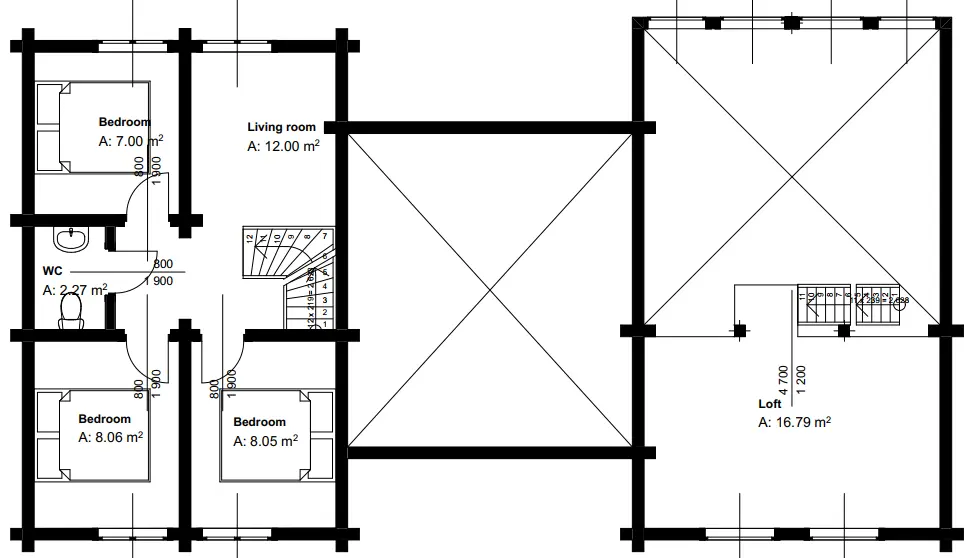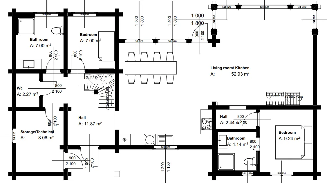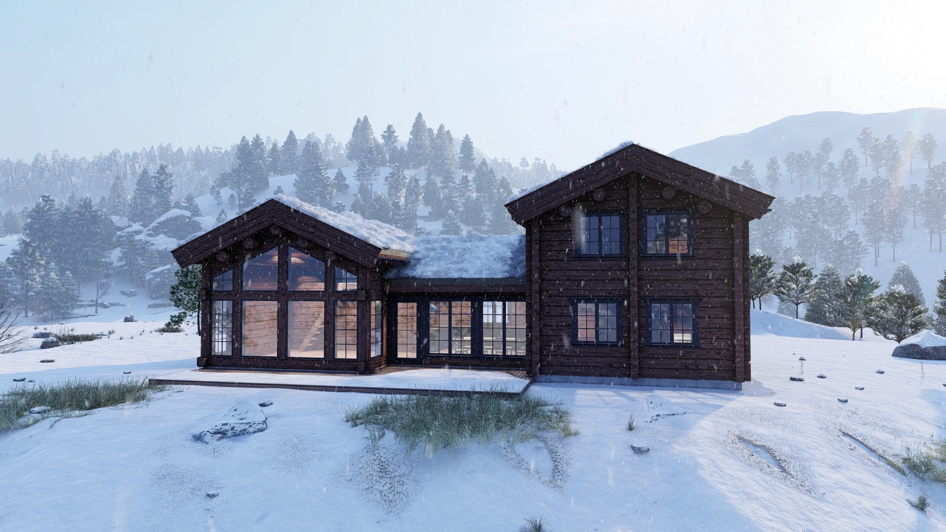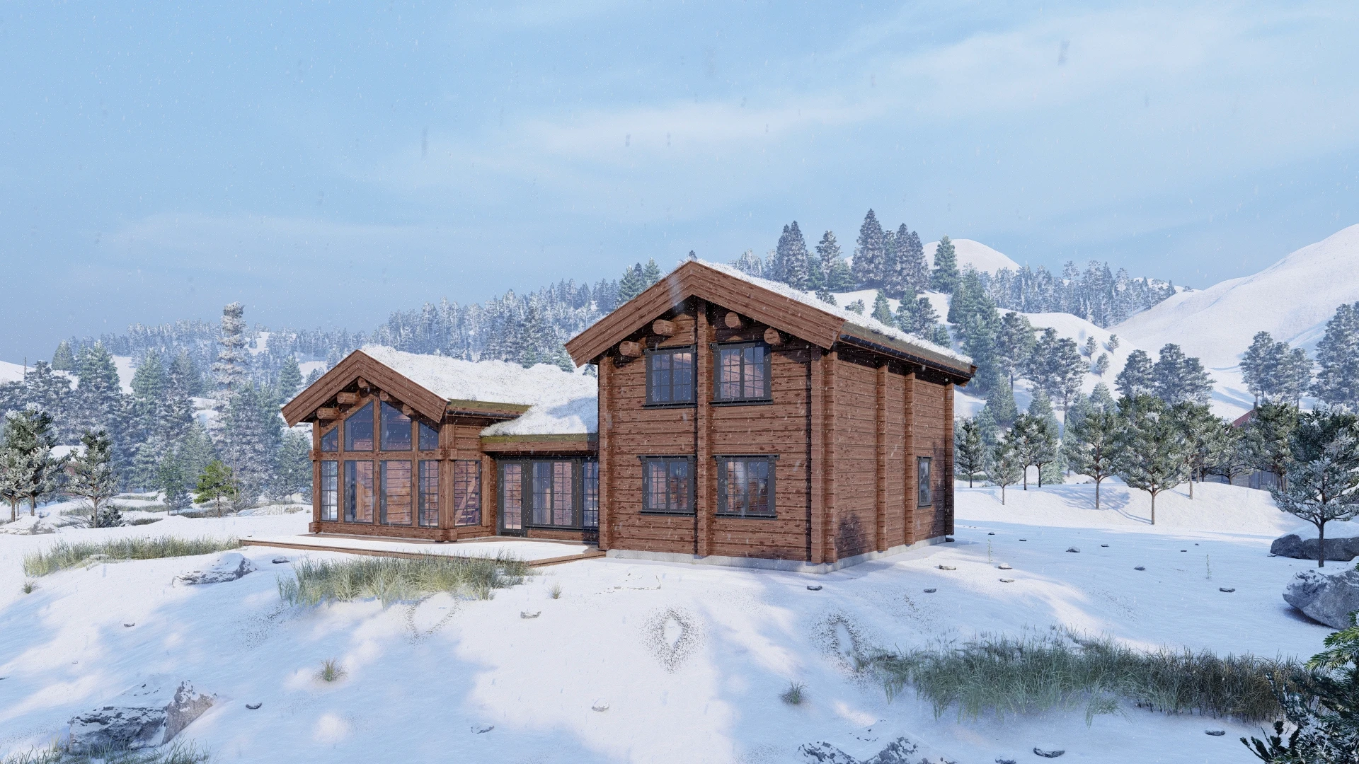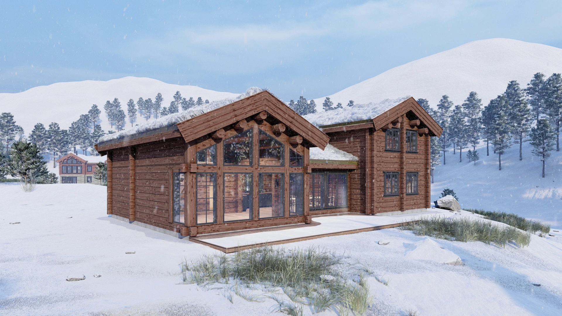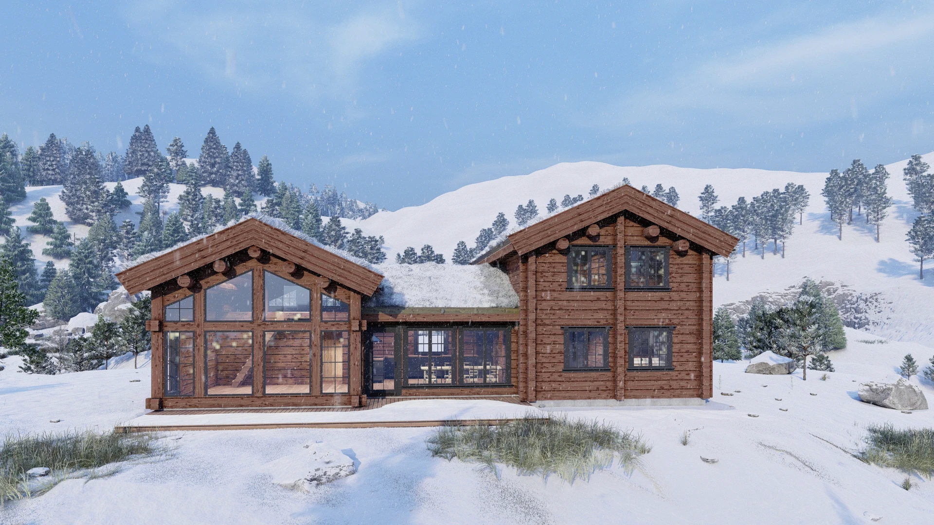 Discover LC159, a stunning 159.12m² log cabin that seamlessly blends rustic charm with modern luxury. This thoughtfully designed retreat welcomes you with a spacious 52.93m² living area flooded by dramatic ceiling-to-floor windows, creating an unforgettable connection to the mountain landscape. With five private bedrooms, two bathrooms and two WCs, LC159 comfortably accommodates families and groups while maintaining an intimate, cozy atmosphere. The versatile 16.79m² loft and charming 12m² upper-floor living space offer flexibility for quiet reading nooks, additional sleeping areas, or simply unwinding with panoramic views.